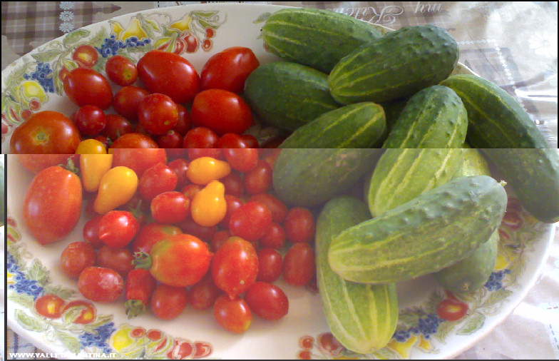 Pensavo all'oidio per la poca ventilazione, ma non è che ne sia convinta del tutto, né dell'oidio (che solitamente, per come lo conosco, colpisce l'intera foglia, quasi fino a diventare tutta bianca), né della peronospora, che parte con delle macchie giallo/marroni, fino a seccare tutta la foglia e creare pure delle macchie nere sui rametti, cosa che non vedo. Sono macchiette circolari che colpiscono solo le foglie (non tutte) ed hanno dentro un disegno circolare... Sicuramente entro domani sfoltirò le piante togliendo le foglie colpite ed eliminando quelle più "ammucchiate" contro la parete della serra, poi vediamo come va. libellula69 ha scritto: hai fatto il posticino per i giaggioli viola? Domani li raccolgo e lunedì te li spedisco mandami l'indirizzo in mp ( presumo sia quello dell'agriturismo ma non so...)  Grazie libellula!!! Ti mando l'indirizzo. Adesso fa troppo caldo per lavorare nei campi, così mi prendo il tempo per pubblicare altre foto… I piccoli grandi raccolti di tutti i giorni. Allegato: