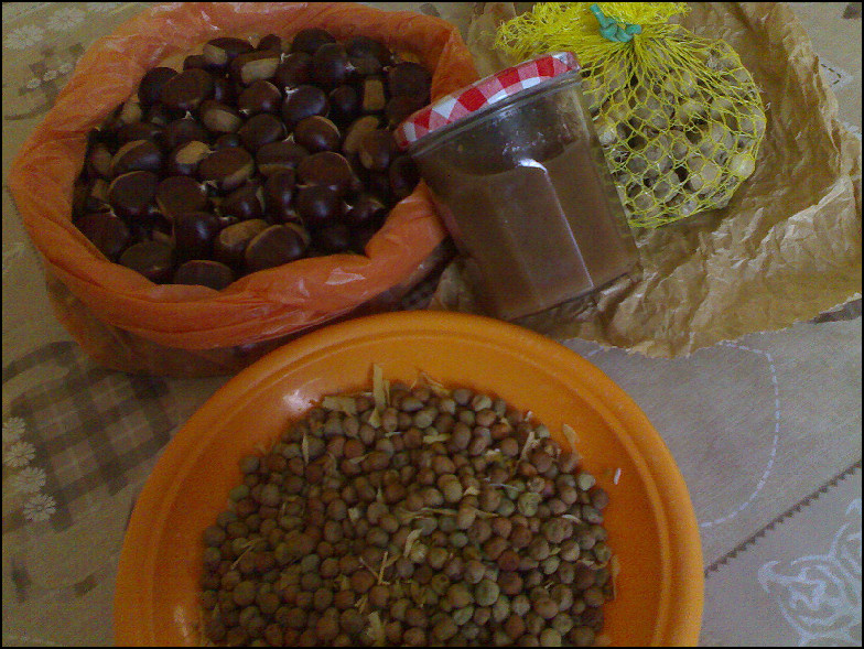 Prodotti dalla terra di Lecco, un graditissimo regalo di Mauro. Primizie e bontà quali castagne e marmellata di castagne e poi bulbilli di allium da fiore e semi di taccole (piselli mangiatutto).