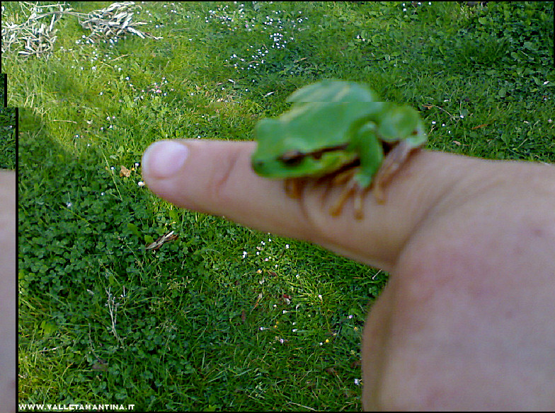 Una curiosa ranocchietta verde (raganella) mai vista dalle mie parti (qui di solito ci sono quelle rosa/marroni). Allegato: