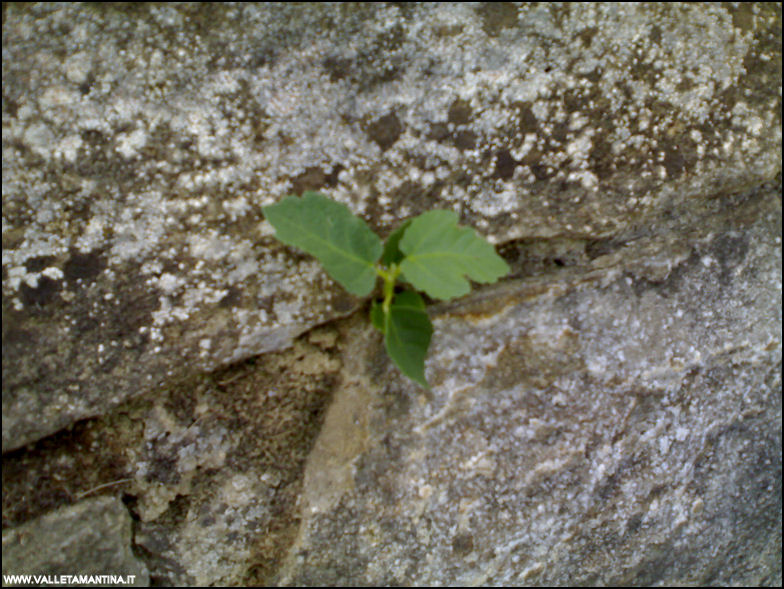Un fico, con un bel temperamento tenace, esce da un muretto in pietra.