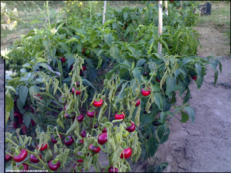 Due piante stanno seccando e non ne capisco il motivo (l’irrigazione è la stessa per tutte, non vedo attacchi di insetti, cimici, marciumi particolari sulle piante…); un’altra pianta nella fila accanto sta iniziando ad appassire (l’unica cosa che mi viene da pensare è un probabile attacco di una mosca – se esiste - che colpisce i peperoncini; qualcuno sa darmi una spiegazione?).