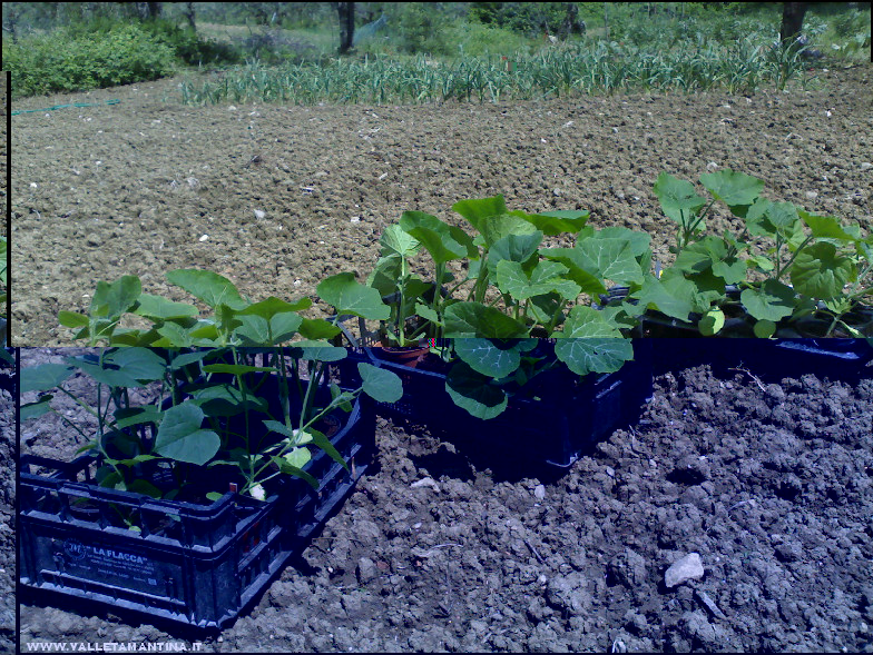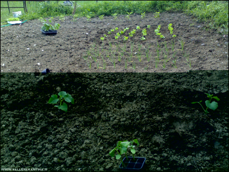 Oggi pomeriggio, nonostante la terra non ancora asciutta, abbiamo trapiantato nei due orti insalata, cetrioli, zucche, zucchine, meloni (è il primo anno che piantiamo meloni, sono 3 varietà di cui ho ricevuto il seme l’anno scorso da Marcello).