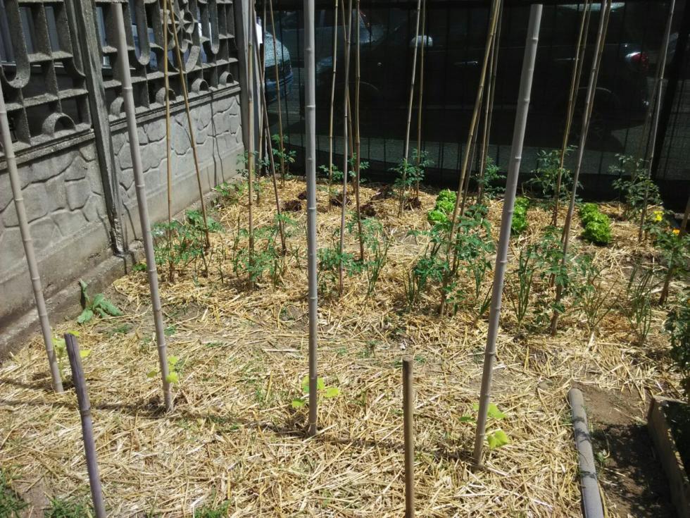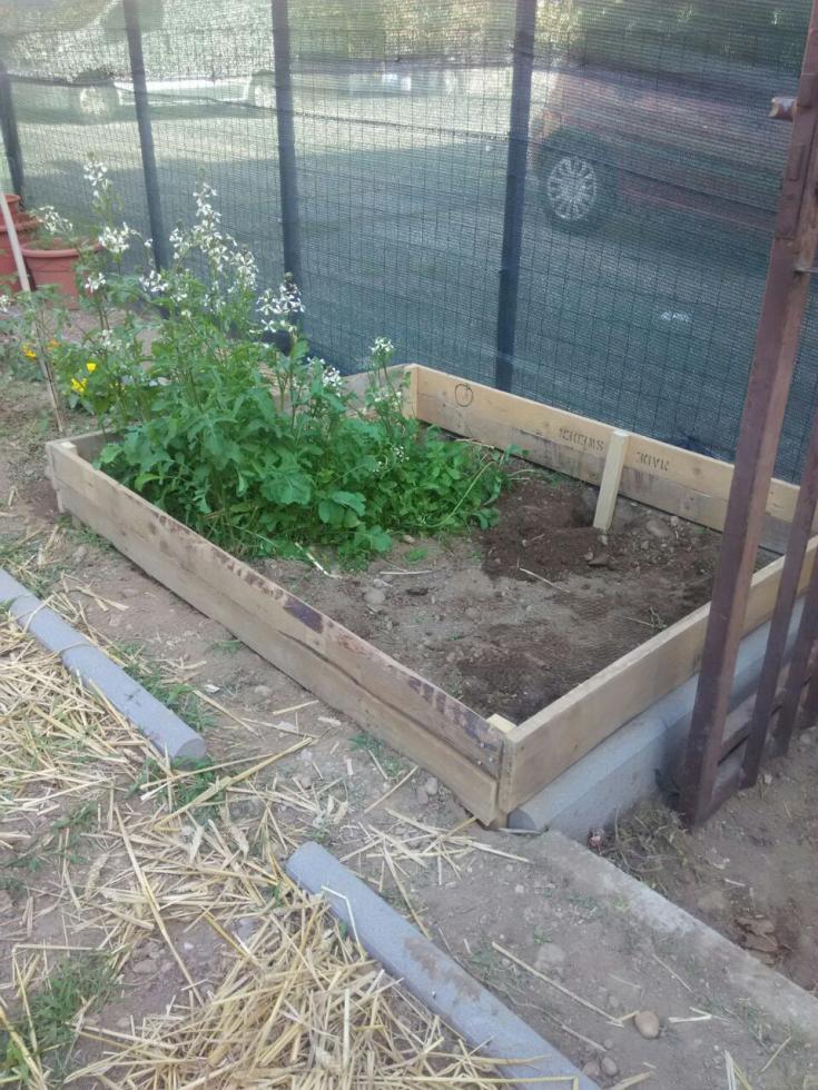 Tutte assi di recupero tenute insieme da quattro viti. Non ho trattato il legno in nessun modo, quando marcirà sostituirò assi e bastoni interrati. La rucola in fiore mi attira le api, la lascio lì finchè non capisco cosa piantare nel cassone.