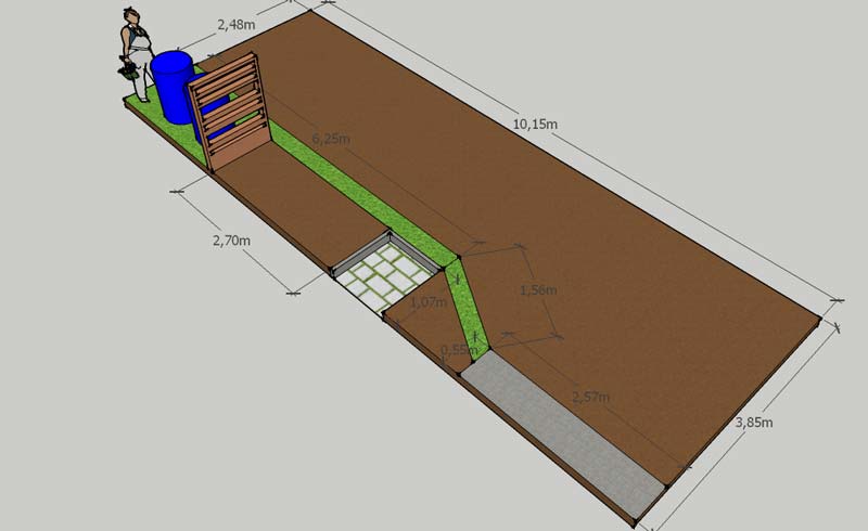La parte grigia in basso è un basamento in cemento, in verde il piccolo camminamento largo 30cm che porta alla zona bidoni. Tutto il resto è quello che ho pensato sia coltivabile. Oggi ho sparso stallatico e iniziato a vangare, me ne manca un angolino ma domani dovrei finire anche di zappare e rastrellare. Come suddivido? Sicuramente in fondo vicino al cemento i pomodori visto che è la zona più esposta al sole.