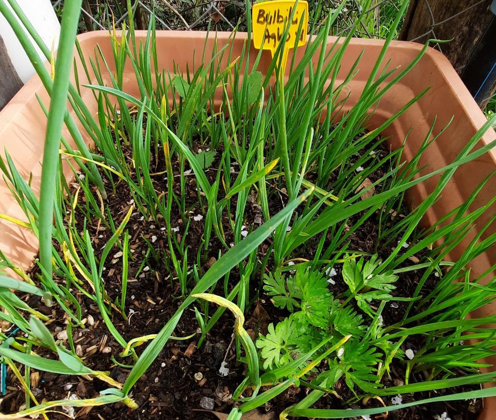 In autunno ho piantato in un vasi i bulbilli del aglio. Nel messe di marzo si trapiantono a terra. Un modo facile di riproduzione del aglio. I bulbilli non sono i bulbi di aglio, ma dei minuscoli bulbi non divisi, che possono essere utilizzati alla stregua di semi. Si sviluppano di solito sullo scapo fiorale, vicino all'infiorescenza