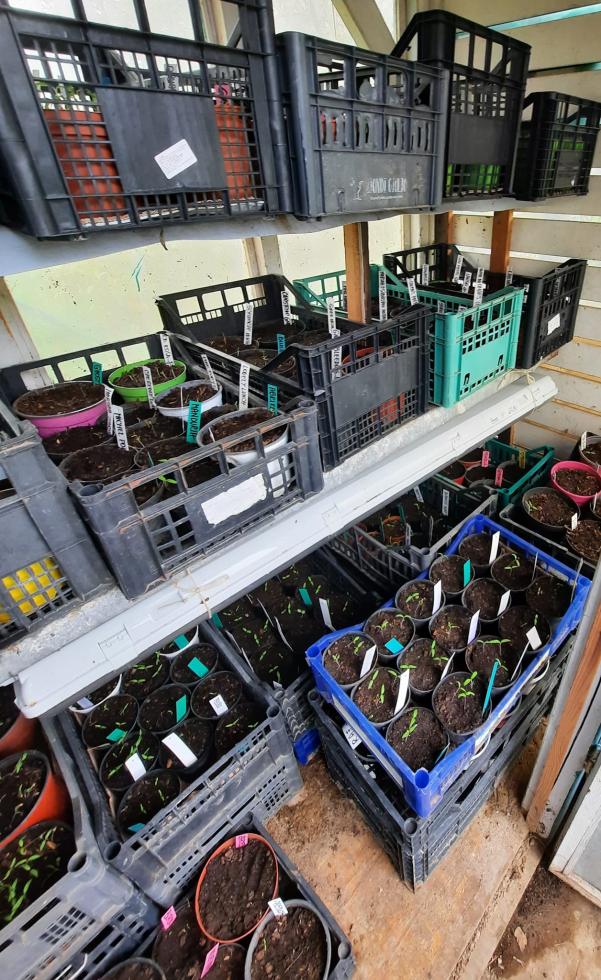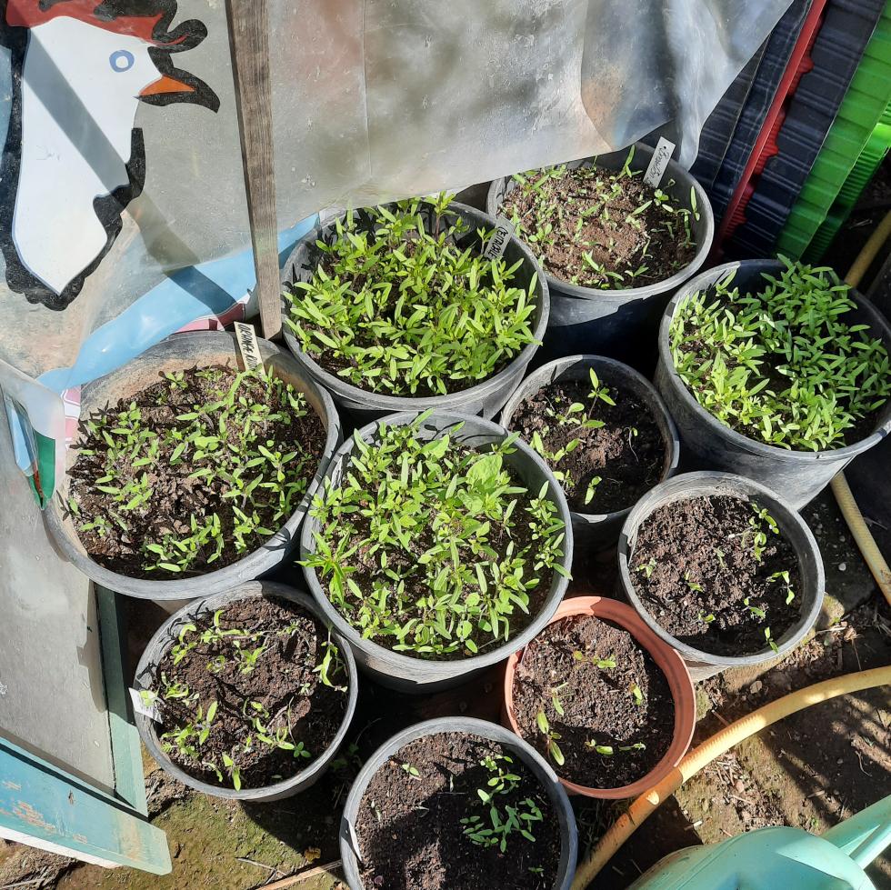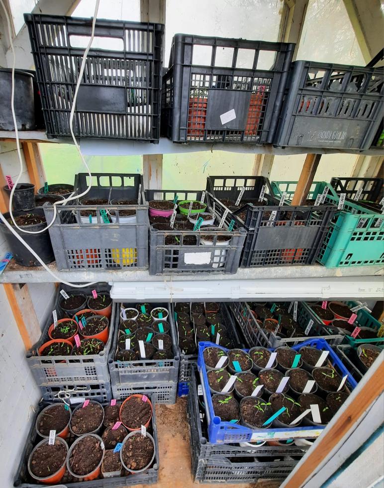 La semina dei pomodori l'ho iniziata il 6 di marzo. Li tengo in una serra fredda. Quando iniziano a nascere metto una lampada per aumentare le ore di luce della quale ha bisogno il pomodoro. Come lo spazio non bastava, ho dei vasi anche fuori serra, coperti con la plastica