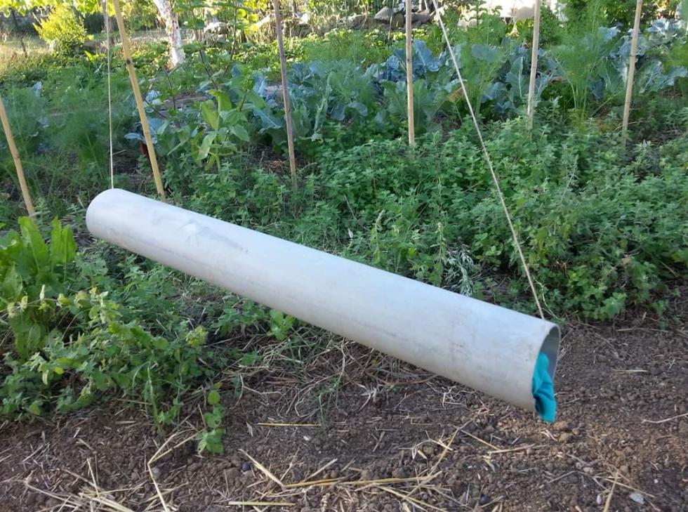 Eco la trappola per raccogliere le cimici svernanti, da posizionare in autunno. È un tubo di un metro del diametro 100 mm riempito ma non pressato con maniche da tute da ginnastica o felpe , va posizionata vicino alle piante di pomodoro;a dicembre, gennaio si estraggono le maniche che sono piene di cimici si scuotono su un pezzo di nylon e si raccolgono.