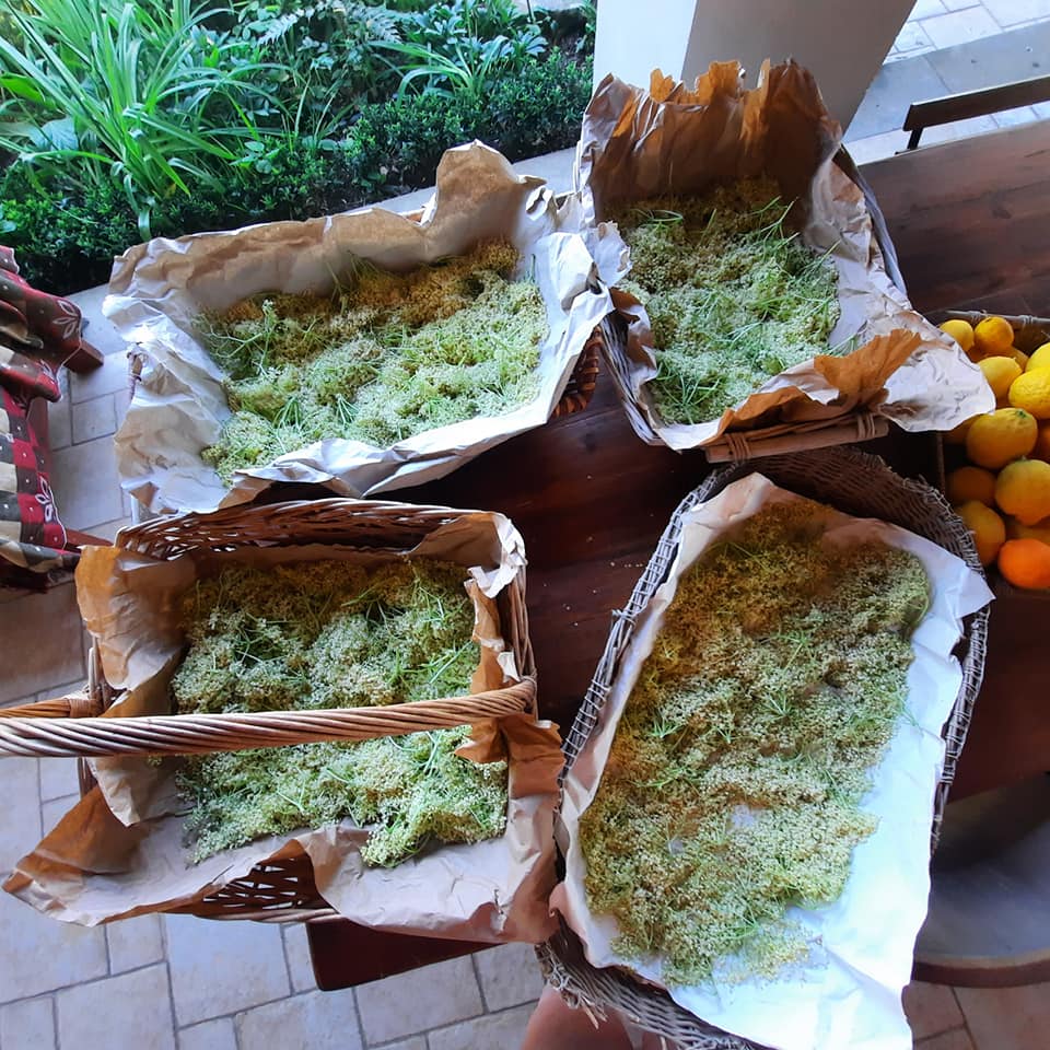 SAMBUCO - Sambucus nigra - dal greco sambike, ossia un flauto ricavato dalla corteccia della pianta, è una specie botanica di origine antichissime. Tutte le parti della pianta possono essere usate: i rami per costruire flauti, fiori per fare sciroppi, fiori in pastella, i frutti per fare marmellate per fare inchiostro. E diaforetica, diuretica, lassativa, debolmente antinfiammatorie e stimolante la secrezione bronchiale Io la uso per fare un succo frizzantino. Da adesso fino a settembre, questo succo non manca mai. I fiori li raccolgo, li faccio seccare a ombra è in un posto ventilato. Ricetta: Per quattro litri e mezzo d'acqua, servono 8 fiori freschi di sambuco oppure 5 fiori secchi. La ricetta dice 400 grammi di zucchero, ma io metto poco più di 200 grammi; 3 o 4 limoni, se sono bio pure la buccia. Si mettono al sole, si gira 2 o 3 volte al giorno. Con questo caldo, il terzo giorno diventa già frizzantino. Non lasciare oltre il momento giusto poiché, diventa vino frizzantino. Meglio assaggiare ogni giorno.