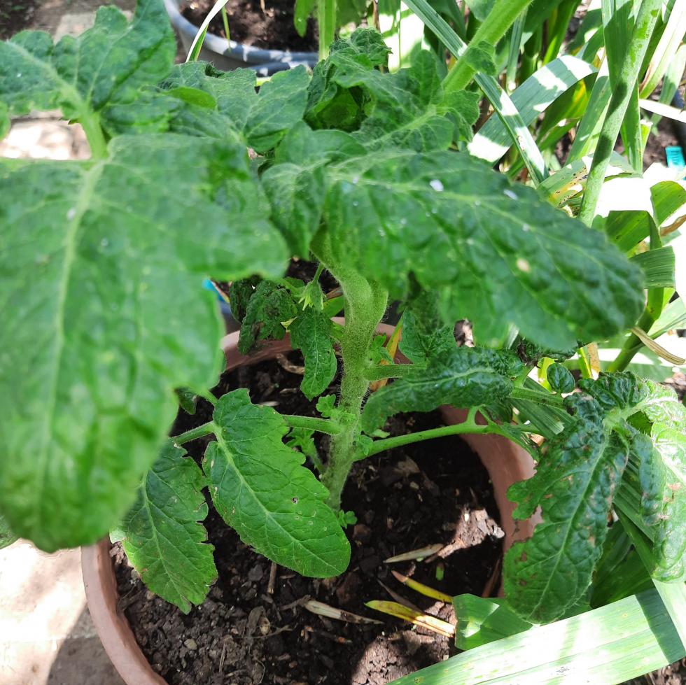 Vi presento la varietà di pomodoro "dwarf"; significa: nano/gnomo, in pocche parole si possono coltivare nei vasi. Sono molto belli a vedere, fusto e foglie carnose di un verde intenso. Paragonando alle varietà da coltivazione a terra sono molto più avanti e hanno resistito meglio alle piogge continue del ultimo mese.