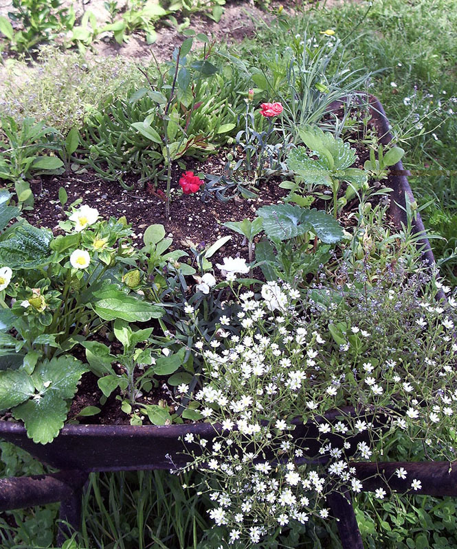 3. un altro angolino con: rose (sempre fate da me) calendula, margherite, cotonaster, orignao, evonimus...