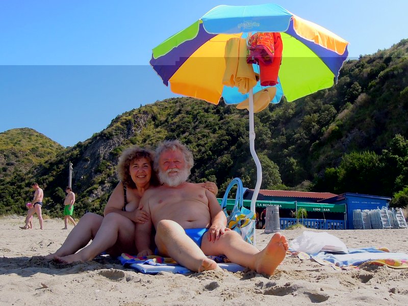 Caro Nino, sembri Nettuno spiaggiato con una sirena...  p.s. Il manico dell'ombrellone è stupendo