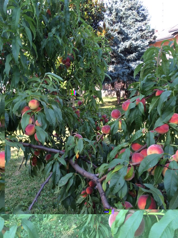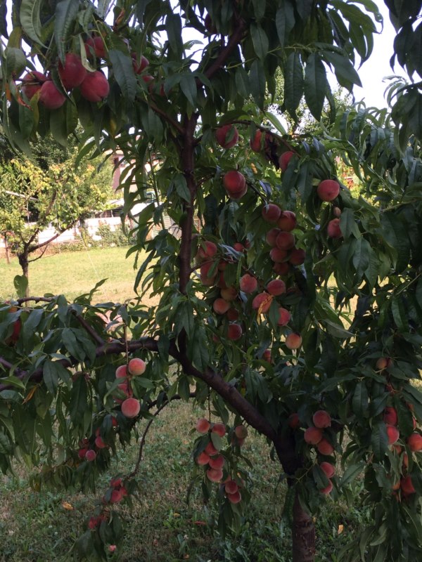 I peperoni credo siano scottati dal sole. Le pesche non so come doradi, ma mi sembra che sulla parte apicale del rame ne hia più, dirada in maniera da averle distribuiti lungo tutta la lunghezza del ramo.