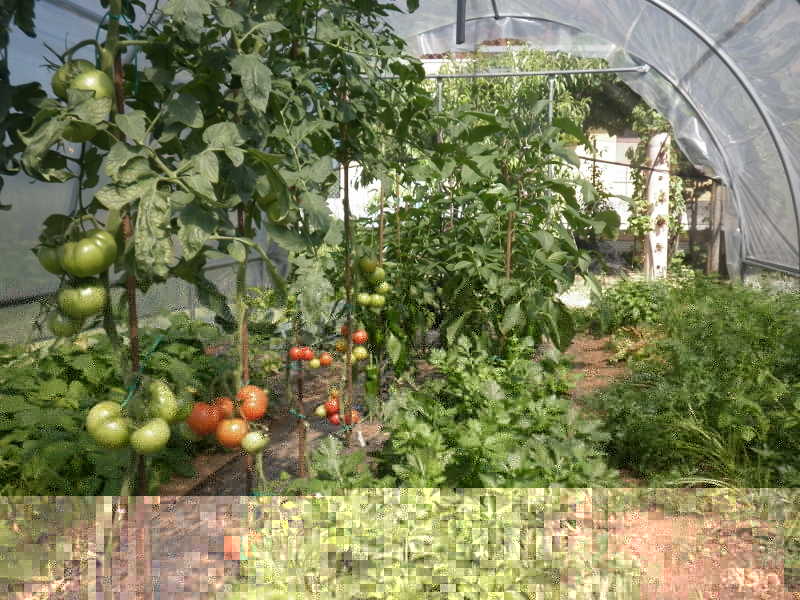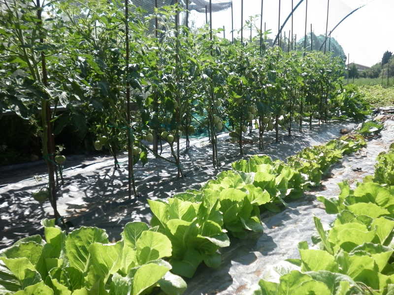 sotto il tunnel, oltre ai soliti zucchini e insalate ho trovato i primi pomodori e melanzane maturi oltre ai fagiolini.