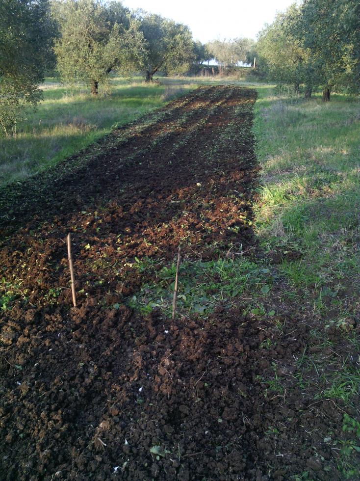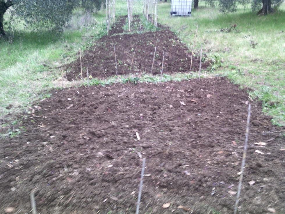 La striscia lavorata è circa 150-200 mq......in una parte ho già piantato: fave, piselli mezzarama, cipolle rosse, bianche e gialle, e aglio, l'altra parte è pronta per ospitare tutti gli ortaggi primaverili estivi.