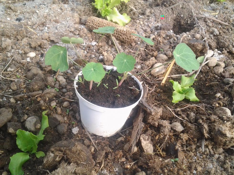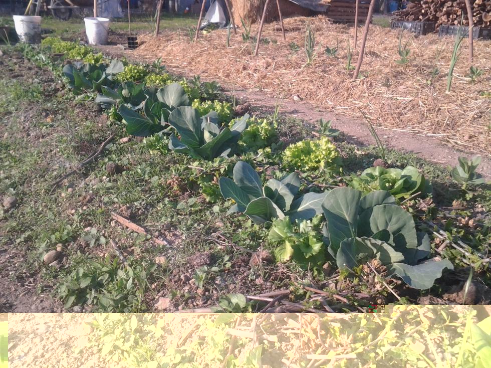Cavoli cappucci, fave, gentilina, trocadero, regina dei ghiacci e qualche cipolla qua e la. Sulla sinistra dei cavoli spuntano tegoline tra la pacciamatura
