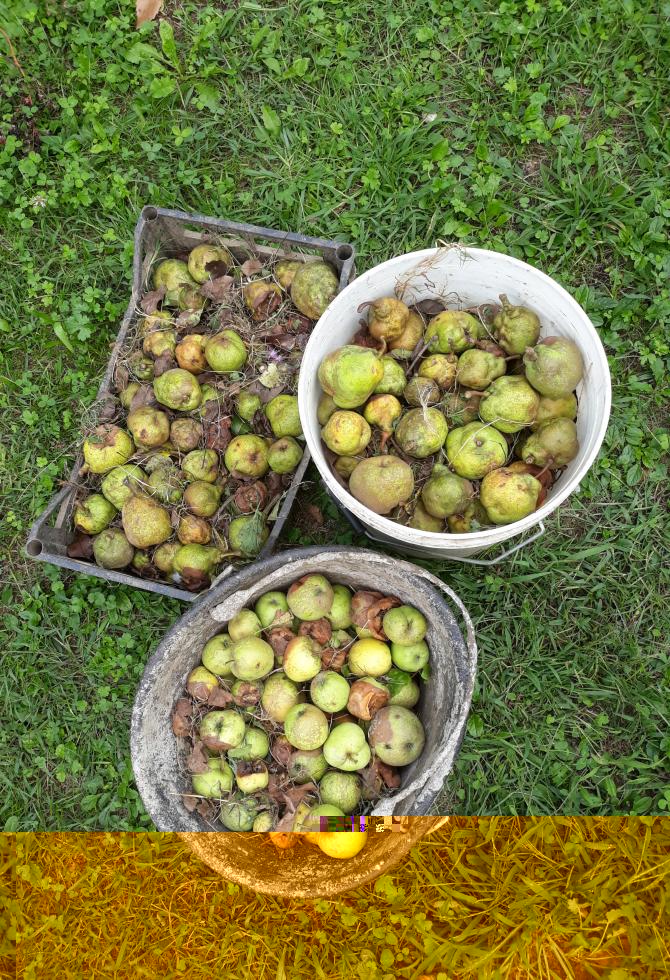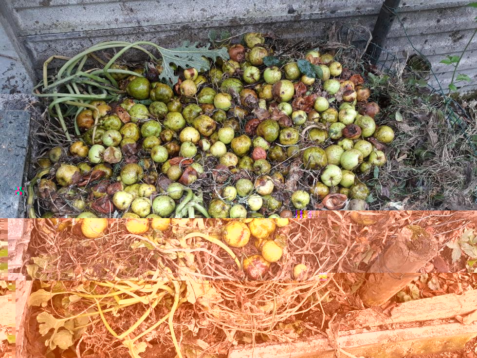 le zucchine che ho estirpato sono finite nella compostiera. per garantire l'equilibrio tra "parte secca" e "parte umida", e per accellerare il processo di decomposizione, ho aggiunto della frutta caduta dagli alberi - mele e pere.