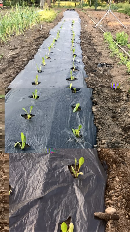 in merito ai danni del freddo... credo di essere quello a cui è andata meglio... ho buttato via solo 10 piante di melone il resto si è salvato tutto... i cavoli hanno le foglie grosse bruciate ma il cuoricino è bello e la pianta è ben in piedi quindi direi che li possiamo lasciare... il telo del'autostrada purtroppo non sono riuscito a recuperarlo, quindi l'autostrada è scoperta, voglio provare a metterci la paglia perchè stendere il mather-b con gia le piantine la vedo mooolto dura...l'altra fila invece sono riusito a salvarla!! guarda qua che lavoretto