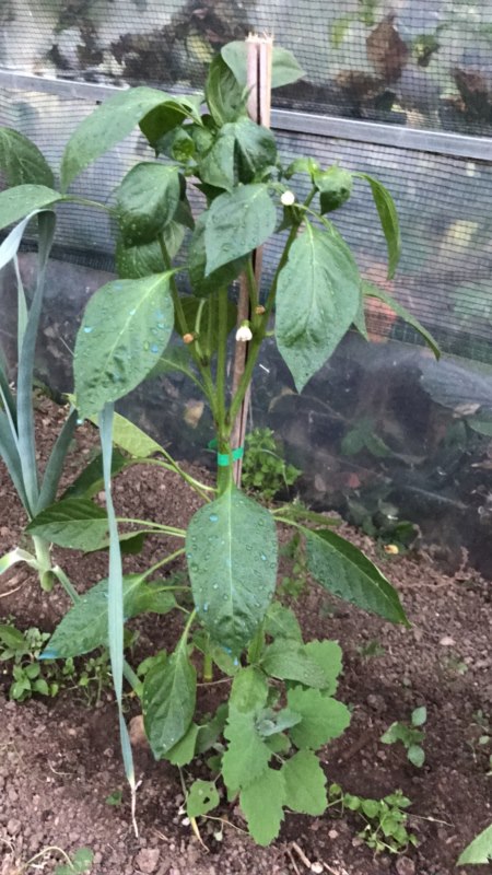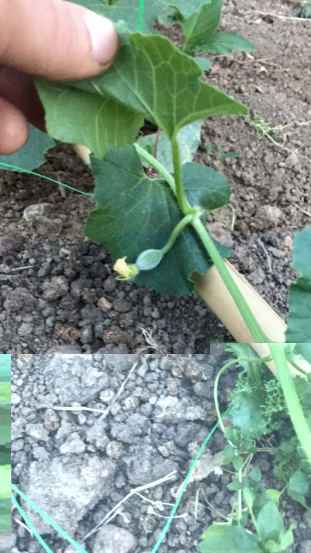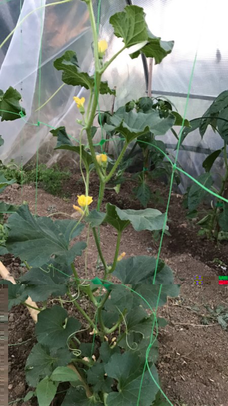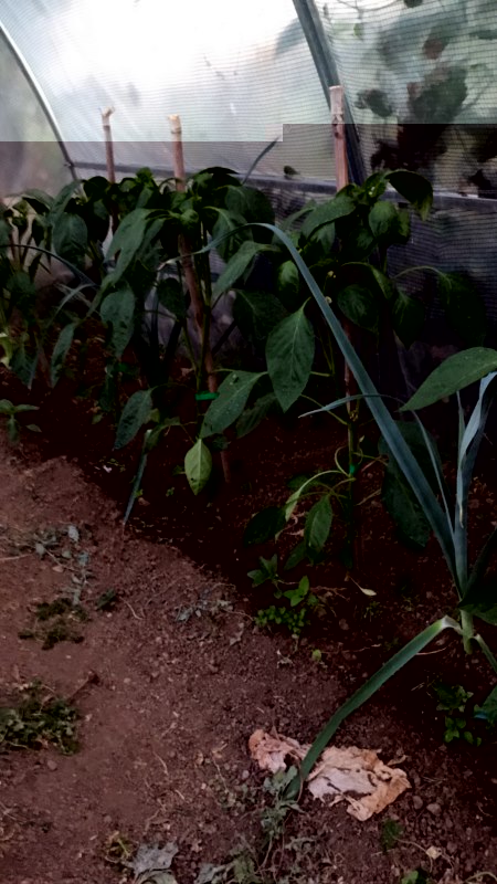 ma veniamo alla serra.... primo melone!! nato su ramo secondario... cimato... il ramo primario continua a salire per conto suo... tutto fiorito ma niente meloni... i peperoni sono fantastici... belli rigogliosi e fioriti... quelli fori sono mooolto piu indietro..vedete le foglie bagnate perchè ho dato il calciomagnesio via fogliare poco prima di fare la foto