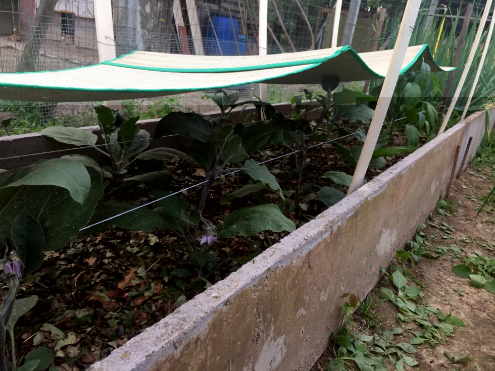 Finalmente il clima si è sistemato e ho potuto piantare anche melanzane e peperoni, ho fatto una struttura che si può regolare in altezza con un paio di stuoie prede dai cinesi a 1.50€ l’una per ombreggiarli perché avevo notato che il sole delle ore centrali faceva ammosciare le foglie delle piantine, inoltre altro piccolo esperimento ho pcciamato con foglie di lauroceraso triturate provenienti dalla potatura della siepe di casa. Allegato: