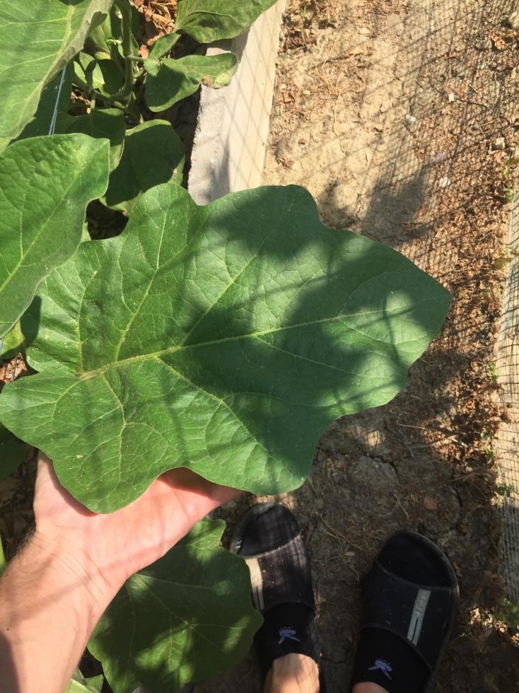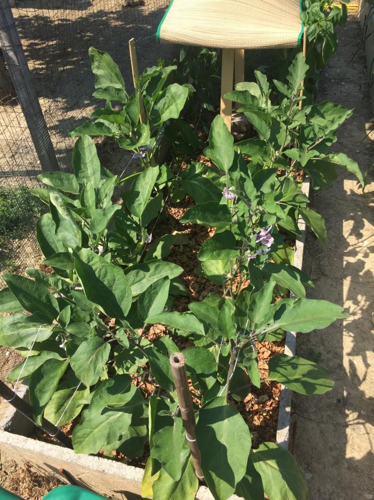 Le melanzane stanno crescendo proprio bene e non hanno più bisogno di essere protette dal sole eccessivo, una che fa frutti bianchi ha le foglie grandi come quelle di una pianta di zucca