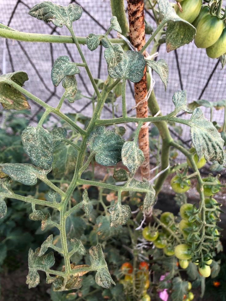Probabilissimo r.rosso (altrimenti tripidi ma il segno è un po' più grande). Da qualche anno nell'area mediterranea in Italia su pomodoro ce ne è uno nuovo che si chiama Tetranychus evansi, ma è sempre rosso.
