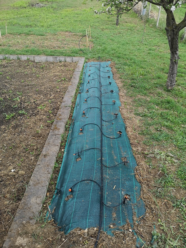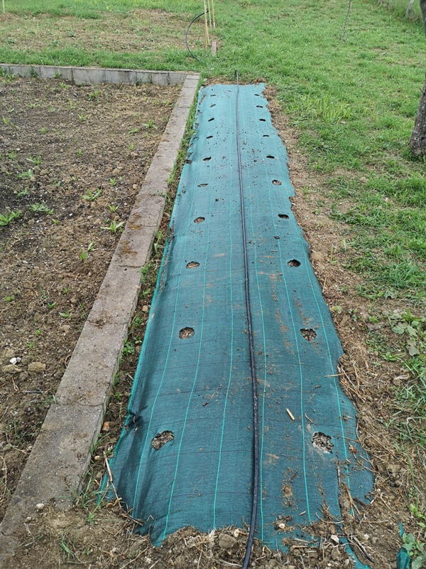 dopo aver collegato l'automatizzazione e l'elettrovalvola con il comando da remoto e aver praticato i fori sul telo pacciamante, ho steso il tubo al centro della proda Allegato: