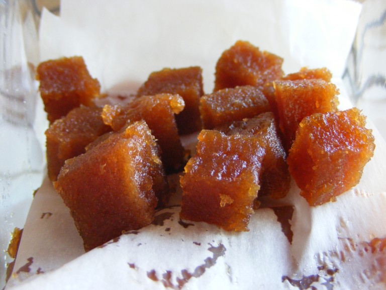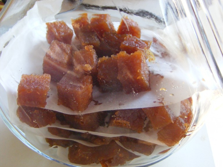 Preso le mele cotogne, lavate e poi messe in una casseruola con acqua e portate a ebollizione per circa 15 minuti, fino a che cominciavano a rammollirsi. Aggiunto acqua fredda, poi tagliate a pezzi scartando il torsolo e le imperfezioni, ma lasciando la buccia. Passate al passaverdura fino a ottenere un purè. A questo punto, per 1800 grammi di purè che così ho ottenuto, ho aggiunto 1000 grammi di zucchero di canna e poco succo di limone e mescolato (alcuni suggeriscono più zucchero, ma io ho preferito così). Messo in una pentola e fatto bollire lentamente fino a farla addensare e raggiungere una consistenza gelatinosa, mescolando ogni tanto. (Attenzione che inizialmente forma delle grosse bolle che aprendosi possono schizzare). C'è voluta più di un'ora per portarla alla consistenza giusta, poi l'ho stesa su un piano, sopra della carta forno, dandole uno spessore di 1-2 cm e lasciata raffreddare. L'ho lasciata qualche ora al sole per farla seccare di più, poi tagliata a dadini e messa in contenitore di vetro a strati alternati con carta forno.
