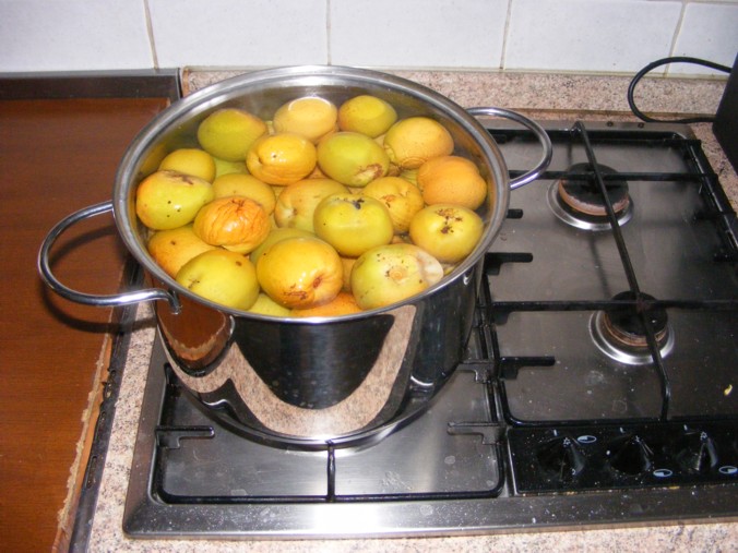 Riprendo questa vecchia discussione perchè anche quest'anno ho fatto la cotognata, documentando con qualche foto le varie fasi, e spero di far cosa gradita mostrandovele. Ho messo i frutti che ho raccolto, circa 3,5 chili, in una pentola con acqua e fatti bollire per circa 15 minuti, per iniziare a rammollirli: