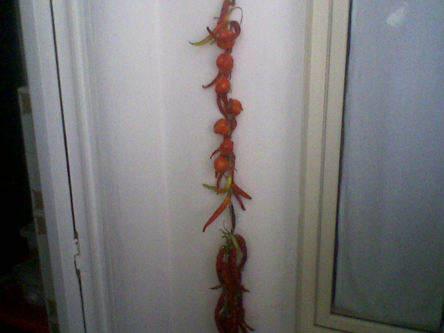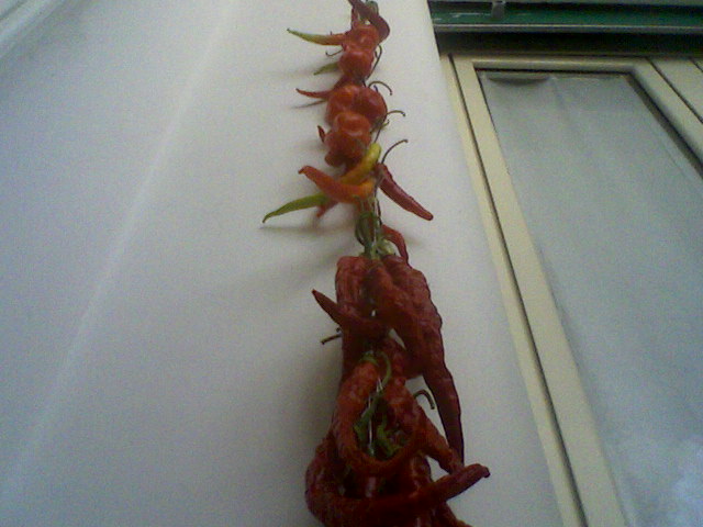 io invece faccio essiccare i peperoncini con la classica corona, quando sono disidratati al 100% li pulisco con un panno di cotone unto (per non bagnarli e togliere l'eventuale polvere) poi li trito e li metto nei barattoli con chiusura ermetica, verso l'olio sopra, e tutti vissero felici e contenti.... metto delle foto indicative di come faccio le corone (in foto sono fresche)