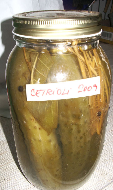 Sul fondo del barattolo si mettono dei rametti di finocchiella, 2/3 fette cren, aglio, 1 cucchiaino senape. Si mettono i cetrioli tagliati a fette julien (noi le facciamo molto fine) a modo che fuoriesce l’aria il più possibile – si spingono nel barattolo (oppure interi con la codina in su). Tra i cetrioli si possono mettere altri rametti di finocchiella. Sopra mettiamo le rimanenze di: senape, finocchiella, aglio, il sale, zucchero, l’aceto. poi si mette l’acqua (meglio se bollita e raffreddata) a modo che coprono i cetrioli. Chiudiamo il coperchio e sterilizziamo. I cetrioli cambieranno veloce il colore (circa 10 minuti dopo l’inizio del bollore). Poi lo mettiamo rovesciato nei panni finche non si raffreddano.