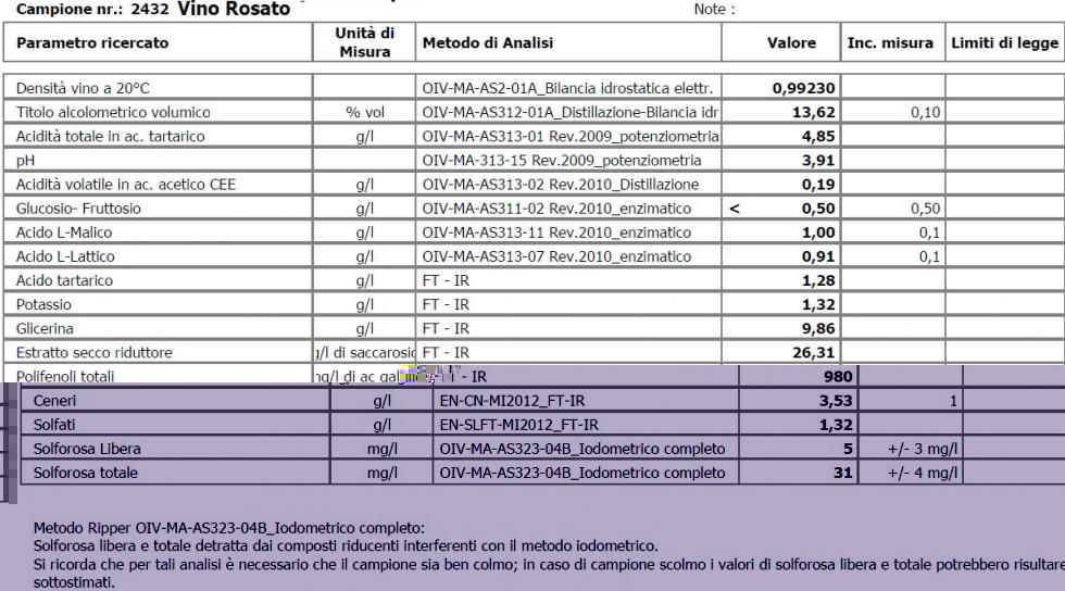 Vino Rosato Acidità bassa e pH alto, un'acidificazione è consigliata con 100gr/hL di acido tartarico sciolto bene. Dopo l'aggiunta di acido tartarico possibile formazione di precipitati tartarici in seguito. La malolattica generalmente nei vini rosati è sconsigliata, ma dalle analisi risulta parzialmente avvenuta e può proseguire. Conviene incrementare le dosi di solforosa, che risultano basse (aggiunta di metabioslfito 5-6 gr/hL sciolto bene in acqua). Ottimo contenuto di volatile, il vino è stato lavorato in maniera ottima.