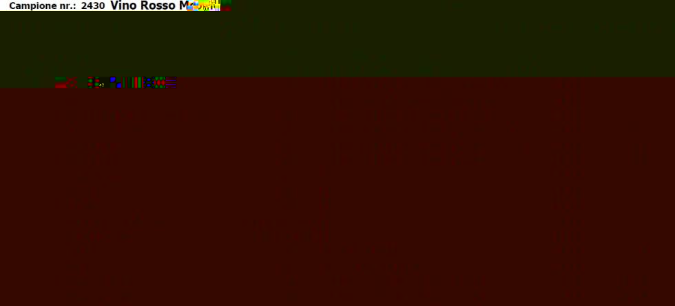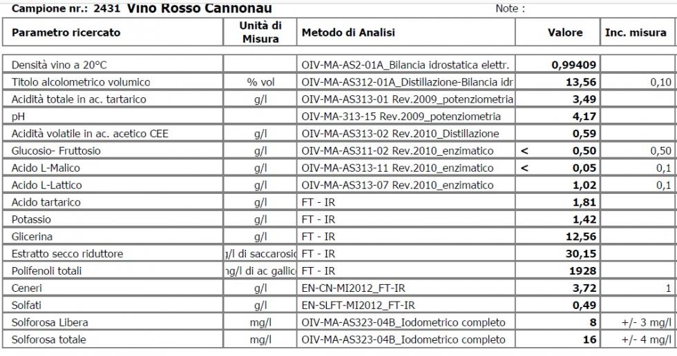 Vino Rosso Cannonau Molto Simile situazione per il pH e l'acidità del secondo vino, ancora più marcato, consiglio qui l'acidificazione con 150 gr/hl di acido tartarico sciolto bene per un migliore equilibrio. Dopo l'aggiunta di acido tartarico possibile formazione di precipitati tartarici in seguito. Conviene incrementare le dosi di solforosa, che risultano basse (aggiunta di metabioslfito 6 gr/hL sciolto bene in acqua). Fermentazione malolattica è completata, il vino se vendemmiato quest'anno ha un valore relativamente alto di acidità volatile, devi trovare un modo per conservarlo correttamente, evitando possibili contatti prolungati con l'aria ed evitando la scolmatura del vino.