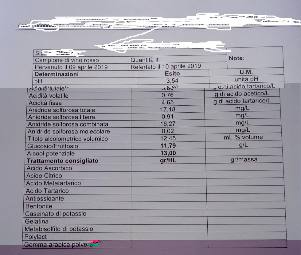 Le analisi per il malico le dovevo richiedere a parte e hanno un costo di 15 euro solo malico. Ho fatto un solo travaso i primi di dicembre. Visto che lo vorrei imbottigliare volevo chiarificarlo e stabilizzarlo. Mi hanno consigliato di usare l'albume d'uovo e la ventinove poi sollecitare e imbottigliati dopo qualche giorno.