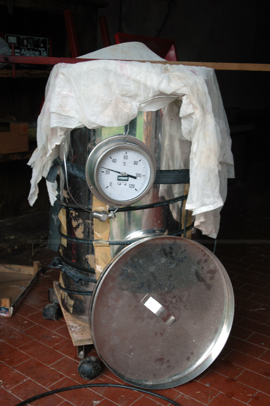 Ecco la foto del mio tino "tecnologico" :D da 110 litri con il coperchio di cui dicevo. L'ho anche avvolto con un cavo riscaldante a temperatura autoregolata a 30° C qualora avessi bisogno di aumentarla all'inizio della fermentazione (non è il caso di quest'anno, anzi credo che dovrò raffreddare...).
