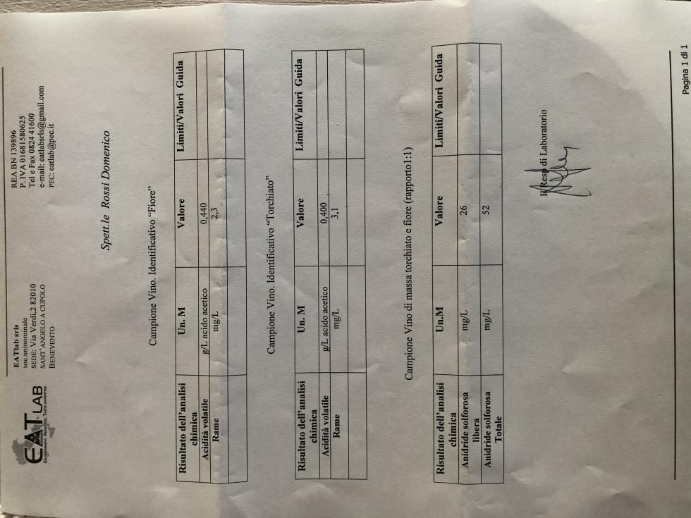 Ciao a tutti, sono un novizio di questo forum (e anche di vinificazione) ho un vigneto di cabernet cortis (varietà PIWI) che quest'anno ho trattato solo una volta con verderame ma purtroppo troppo tardi e a causa anche dell'assenza di piogge ho vendemmiato con i grappoli ancora macchiati di sostanza....risultato ovvio è stato che nelle analisi è uscita una rilevante quantità di rame..(2mg nel fiore e 3mg nel torchiato).. Qualcuno può aiutarmi suggerendomi come fare per abbassarlo e/o qualche prodotto che lo possa catalizzare e farlo precipitare?? Per il resto come sono le analisi?...vi posto la foto