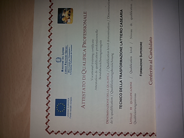 Scartabellando tra i vari attestati dei corsi di formazione che ho fatto negli anni, mi sono capitati tra le mani i due in allegato (ps: il fatto che abbia una qualifica professionale in tecnico della trasformazione lattiero casearia, non vuol dire che sono un mago nei formaggi anzi:-D.. quel corso risale a quasi 10 anni fa, e solo da febbraio di quest'anno ho ripreso in mano qualcosa, e anche grazie al forum, ho iniziato a produrre in casa qualche formaggio. )