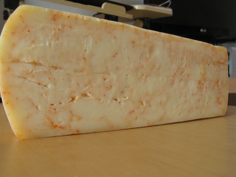 a differenza della ricetta scritta ho dovuto "lavarlo" giornalmente (con salamoia leggera senza peperoncino) e coprirlo con un contenitore lasciando passare poca aria perchè in frigo non ho molta umidità. come si può notare la crosta non ha sviluppato particolari pigmentazioni o muffe ed è rimasta morbida. in bocca ha una consistenza perfetta (ne troppo gommoso ne troppo pastoso) direi proprio buono (si lascia mangiare  ) e nel finale sale un piccante non aggressivo che mi piace proprio...