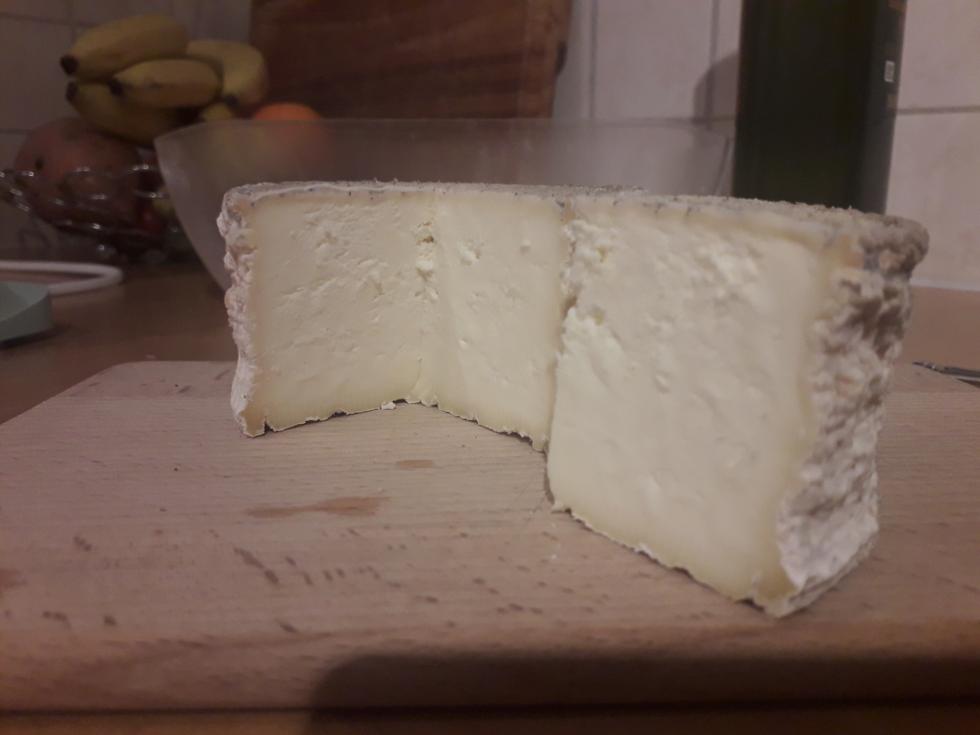 Ecco il mio, purtroppo si è gessata un po' la pasta e la crosta non è proprio fiorita come quella di un brie. Sui piatti sono cresciute le muffe dello stilton che sta stagionando nello stesso armadio. Ho usato dello yogurt come innesto e seguito la procedura tranne per il fattocheho infuscellato i cubi senza fare il taglio a nocciola. A parte tutto il sapore è buono.