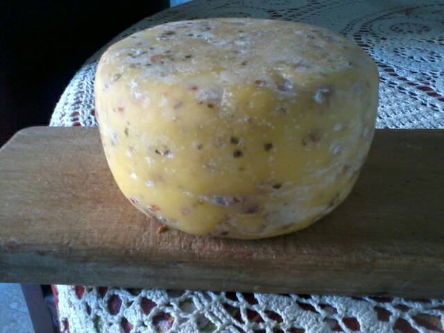 Questo cacioricottta che vi posto la foto, è stato fatto il 3 maggio, e pesa attualmente Kg. 1 e 50 gr. vorrei chiedere se può essere pronto per essere aperto, è un cacioricotta allo zafferano, funghi porcini, origano e pomodorini secchi, l' altro più piccino di 150 gr. l' ho gia assaggiato a 15 giorni di stagionatura per sentire i sapori se erano omogenei e non si sovrastassero fra loro, e quindi ho fatto continuare questa forma nella stagionatura. Sò gia che una persona che mi vuole molto bene dirà che io stravolgo le ricette, ma se devo dirla tutta quello assaggiato a 15 giorni è stata una sorpresa di sapori e odori.