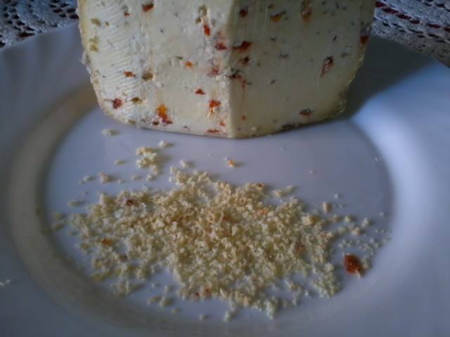 Ecco la foto di una grattatina del formaggio cacioricotta farcito e stagionato, ho solo una grattugia fine manuale, altrimenti dovevo usare quella grande professionale, spero che si veda che è da grattugia, molto buono, profumato e sapore oggi dopo un giorno che ho aperto la forma, ancora di più. Ora aspetto i commenti se devo migliorare qualcosa, o se ad occhio critico di chi esperto ci sono difetti, così posso rimediare e fare meglio la prossima volta grazie