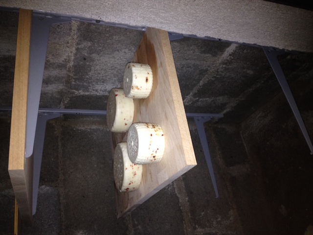 Prossimamente, prevedo di installare ulteriori mensole sul lato sinistro della camera, in caso che la mia produzione casalinga aumenti in quantità, un basamento in legno all'altezza della finestra in modo da permettermi di spazzolare e lavare i formaggi in stagionatura, e creare uno spazio apposito per una vasca per la salamoia, senza dover portare le tavole di stagionatura in cucina al piano di sopra.
