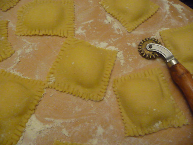 disporre mucchietti di ricotta sulla sfoglia, coprire con l'altra pasta e formare dei ravioli tagliati con la rotella e ben chiusi con l'aiuto di una forchetta.