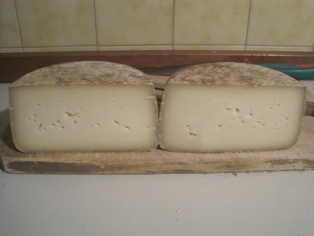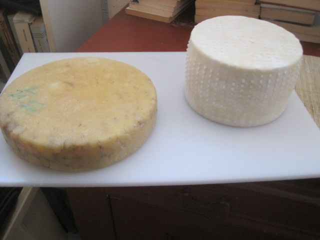 quello a dx è il dopo sale. a sx ho messo un esperimento (cotto e pressato) che avevo fatto a dicembre sempre con siero innesto di un molle, dalla foto non rende però è molto giallo. nella lavorazione ,come vedi dallo scalzo, ho avuto problemi..credo d'aver asciugato troppo la cagliata; lo vorrei stagionare per un bel pò, già ora è bello rigido, il suo futuro sarà in grattugia