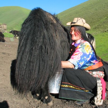 Situata al centro di una grande distesa ovale, sull'altopiano del Qinghai-Tibetano, la prefettura di Golok in alcune sue parti è così pianeggiante che le tende dei nomadi coperte con la lana di yak si possono scorgere a miglia di distanza. A 4500 metri sul livello del mare, la distesa erbosa dei pascoli - straordinariamente verdi per essere a queste altitudini - è interrotta da bassi arbusti fioriti e dalle schiene curve degli yak. Oltre a questi animali dal folto pelo bianco e nero, si possono scorgere soltanto capre, pecore e numerose aquile in volo. Gli yak pascolano nel pianoro e nelle profonde vallate attorno alla contea di Maqin, nella prefettura di Golok, e costituiscono la risorsa principale dei pastori nomadi tibetani, fornendo carne e latte per l'alimentazione, lana per teli e tende, infine sterco essiccato utilizzato come combustibile. Il latte si beve fresco o è trasformato in yogurt, ma il prodotto più apprezzato a base di latte di yak (o per la precisione di dri, nome della femmina) è senza dubbio il burro, che si mangia solitamente fresco, ma si mantiene a lungo. Il burro è tradizionalmente usato per aromatizzare il tè, preparato con tè in foglia, burro di yak e sale. In una magnifica vallata non molto lontana da Golok, presso il piccolo caseificio ********* situato a circa un'ora d'auto dal celebre monastero di Ragya, alcuni casari tibetani producono inoltre una vasta gamma di formaggi utilizzando il latte di dri che i pastori nomadi portano giù dai pascoli di altura, subito dopo la mungitura. Le caldaie di rame utilizzate per la produzione del formaggio sono riscaldate bruciando mucchi di sterco essiccato di yak e il formaggio è realizzato due volte al giorno. Gli yak producono una piccola quantità di latte denso e ricco (può raggiungere anche il 7% di grasso), normalmente scremato per la caseificazione, che mantiene un gusto intenso, simile a quello di un latte ovino primaverile. I formaggi - realizzati in condizioni ambientali estreme - esprimono l'eccellente qualità e la ricchezza del pascolo della zona e si caratterizzano per un sapore "rustico" che ricorda il migliore pecorino. Se stagionati, hanno marcate note erbacee, temperate da un pieno ma delicato gusto di grasso
