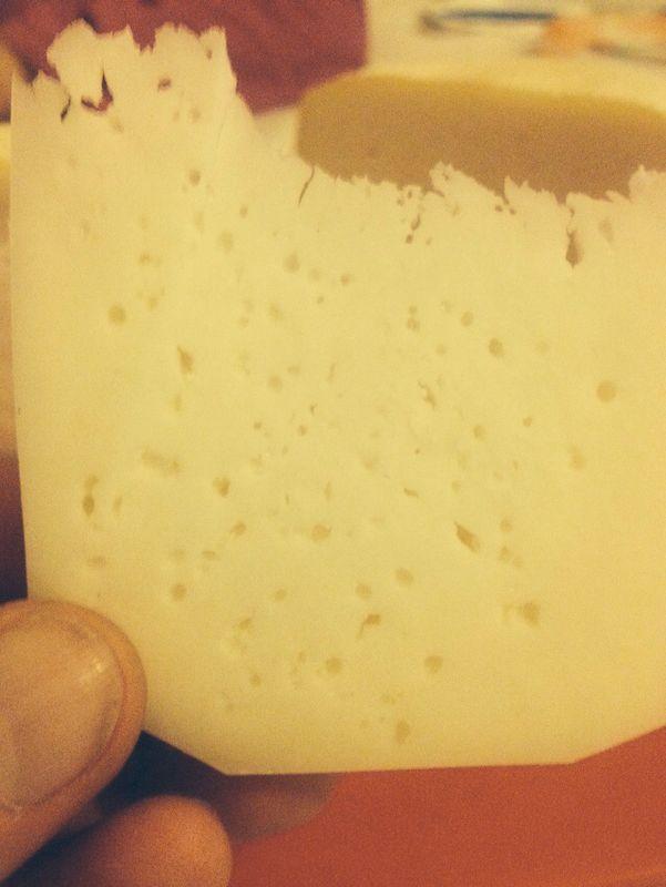 Crosta sottilissima, quasi assente, pasta color bianco candido e la vera sorpresa una moltitudine di buchetti di forma irregolare e di piccole dimensioni, sparsi in modo casuale. Al taglio, osservando quello che mi si è prospettato alla vista (occhiatura marcata ed irregolare), ho subito detto “E’ lui”…….