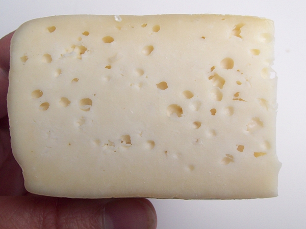 Ecco la foto, così mi dite qualcosa dei buchini che mi parevano tanto carini. Il gusto è buonissimo e la consistenza non appiccicosa. Dovrebbe essere quasi tutto latte vaccino con una piccola percentuale di capra. Non è molto uniforme, nella parte in basso a sinistra c'è una piccola parte un po' "ricottosa" Grazie per il parere.