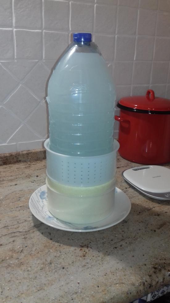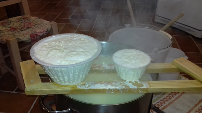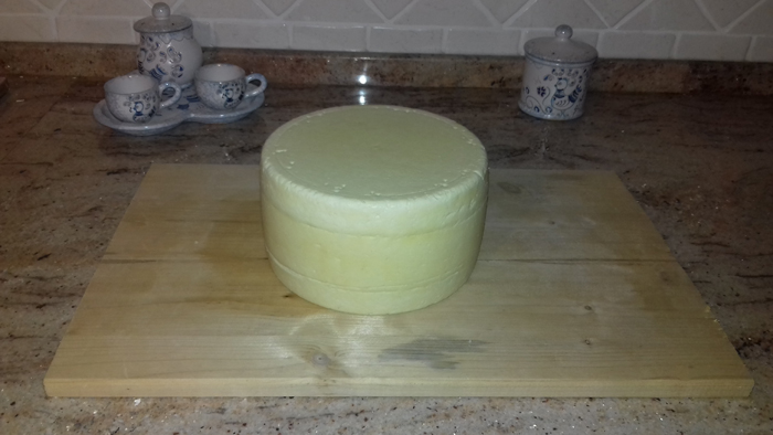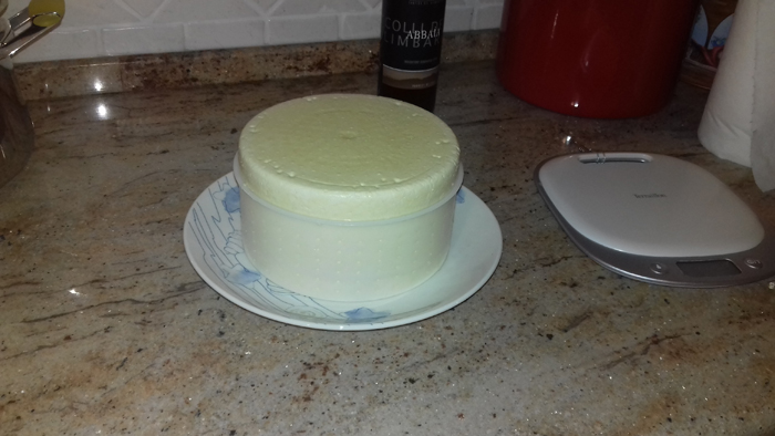 A questo punto raduno la cagliata, la presso leggermente sotto siero e la prelevo con telo e la deposito in fuscella. (La cagliata è un po abbondante rispetto alla fuscella che ho a disposizione). Presso con un peso, purtroppo sottodimensionato (5 kg) in ambiente a 20/22° Rivolto inizialmente molto spesso ( ogni 15 minuti) perché la cagliata sborda dalla forma e tende ad allargarsi nella parte superiore Dopo 4 h immergo la forma in acqua fredda per 4 ore Salatura al 3% con sale fino.