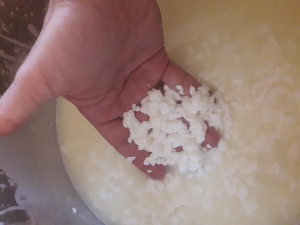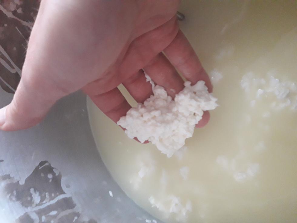 Naturalmente ora sei all'inizio e il siero biancastro ci può stare. Però devi sapere che per tagliare la cagliata bisognerebbe utilizzare strumenti affilatissimi perché meno è affilato più strappa e più strappa, più tanto grasso finisce nel siero.