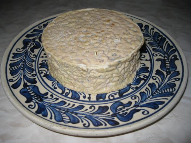 Beh, questo è un mio piccolo tipo Montasio "Shar pei". Stasera ero proprio curiosa, dopo una settimana di assenza e avendo trovato tutti i formaggi nuovamente "impellicciati", con la muffa che esce persino dalla retina di protezione degli scaffali  volevo sapere com'è dentro e se è commestibile o no! Diciamo che di Montasio... non ci sta nulla! non ha ancora due mesi... comunque non mi dispisce, ma non è quello che volevo  Intanto mi sto organizzando per le fascere, ma Tsuna, con le muffe, fino a quanto lasciarle crescere?????? Ho dovuto star via una settimana... dovevo cercare i formaggi tra le muffe!!!