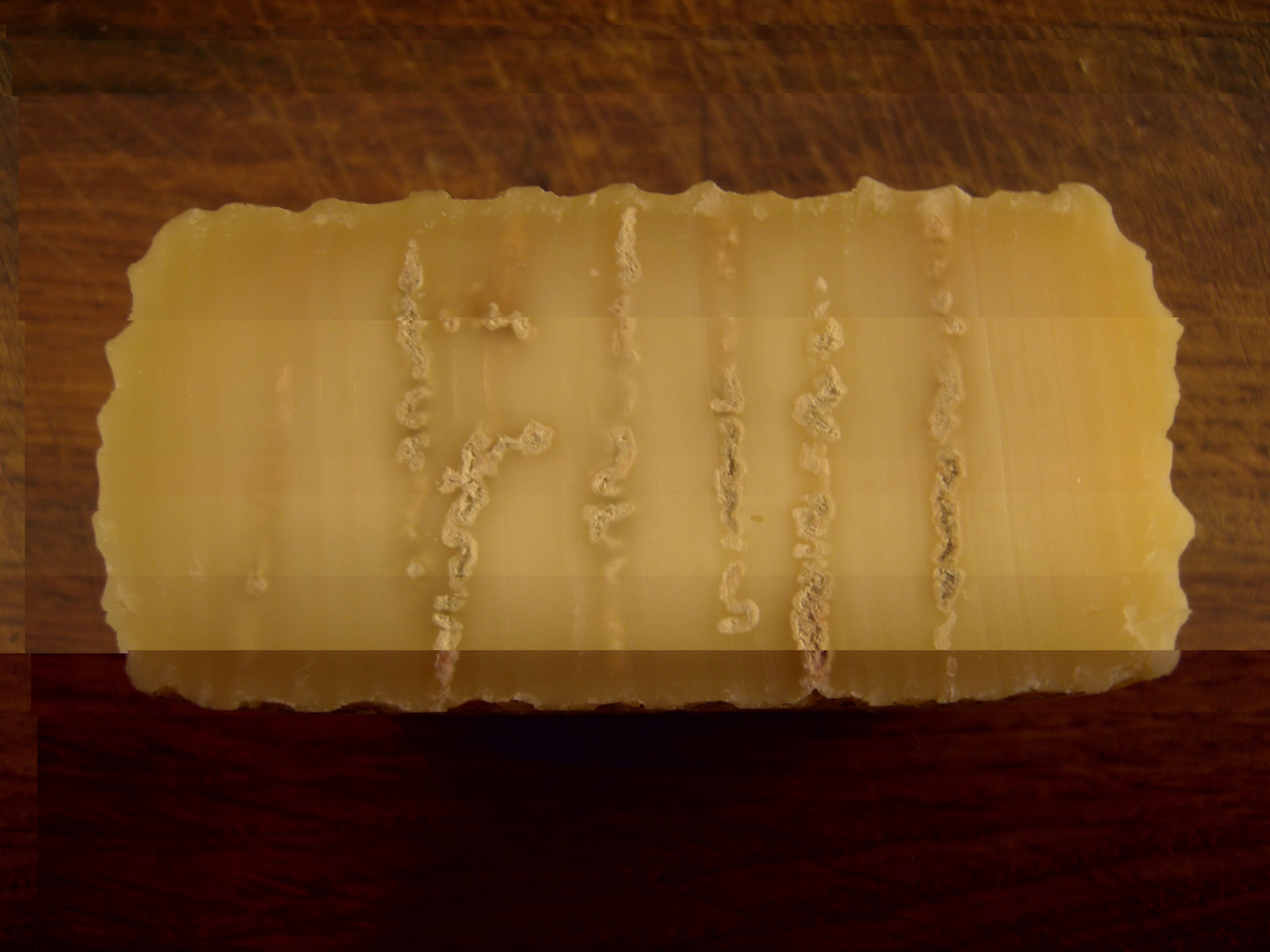 Dopo un'ora dall'ultimo rivoltamento facciamo la salatura a secco, percentuale del sale grosso 2% sul peso del formaggio, strofinate bene e lasciate tutta la notte a temperatura ambiente.Fate un pò di buchi che vadano da una parte all'altra del formaggio (io ne avrò fatti circa una trentina) e mettete a stagionare in un ambiente non troppo freddo 10-12°C per 30/40 giorni e ogni giorno girate il formaggio.Se volete far venire molte muffe vi conviene forare il formaggio più volte perchè essendo in un ambiente abbastanza secco tendono a chiudersi, la mia intenzione era solo di avere pochissime muffe che lasciassero un gusto deciso nel formaggio